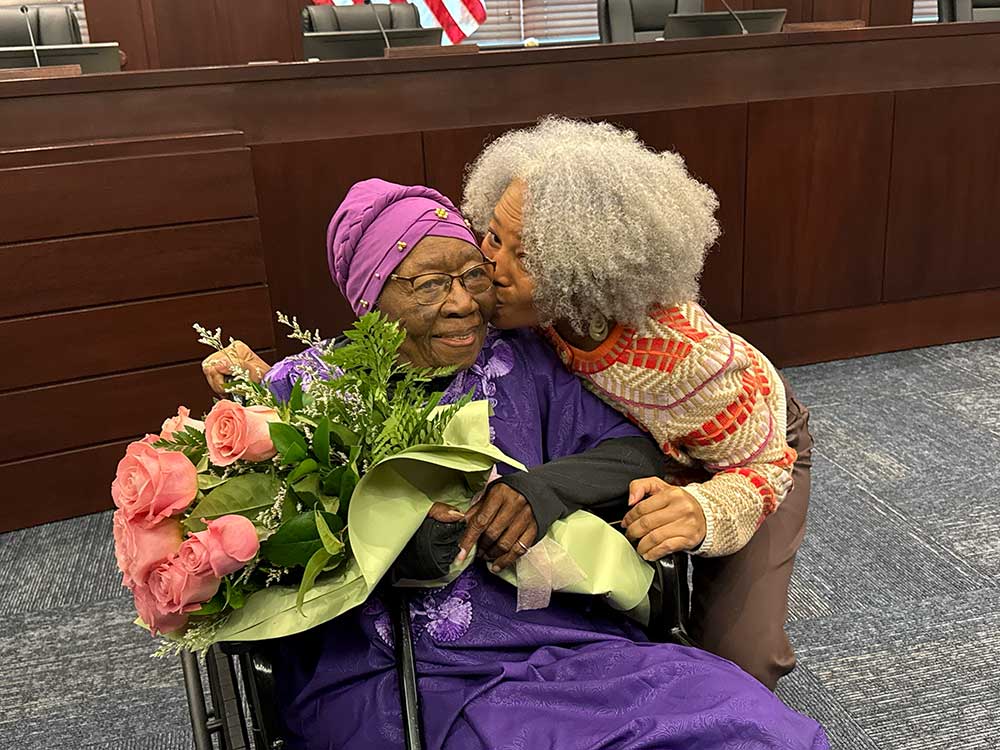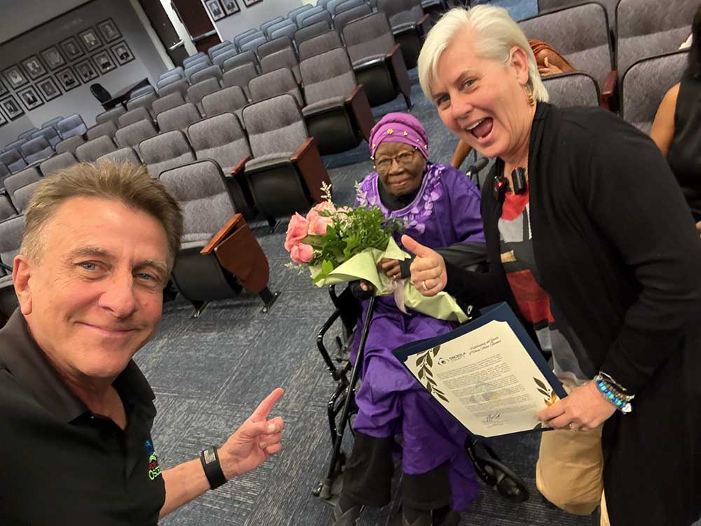 Commissioner Grieb presented Clara with a commemorative certificate and beautiful roses, marking not just a birthday, but a legacy.