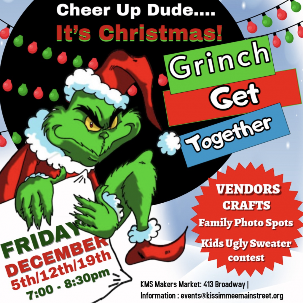 Kissimmee Main Street has invited the Grinch to the Friday night Makers Market the month of December. Join us for games, crafts, vendors, and a weekly “Kids Ugly Sweater” contest.