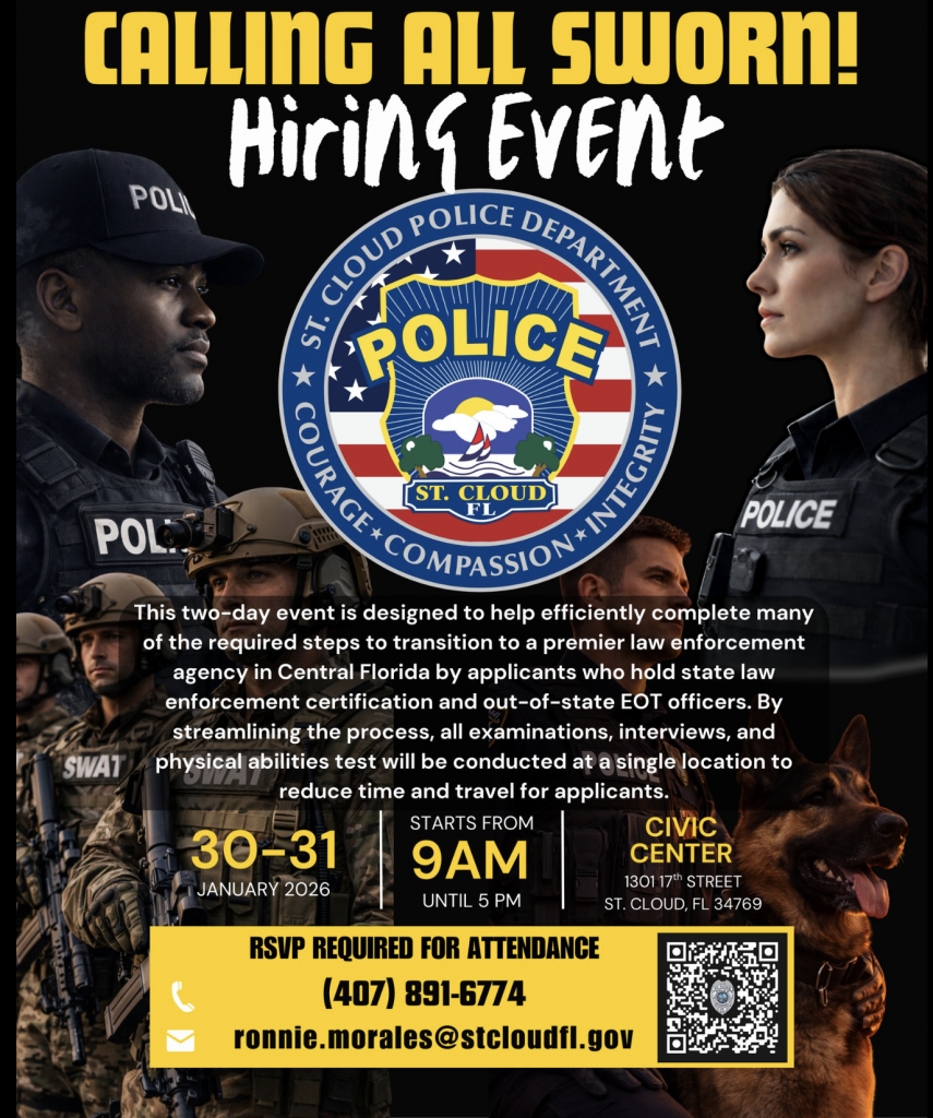 SCPD will hold a hiring event January 30 and 31 at the St. Cloud Civic Center, from 9 a.m. until 5 p.m.