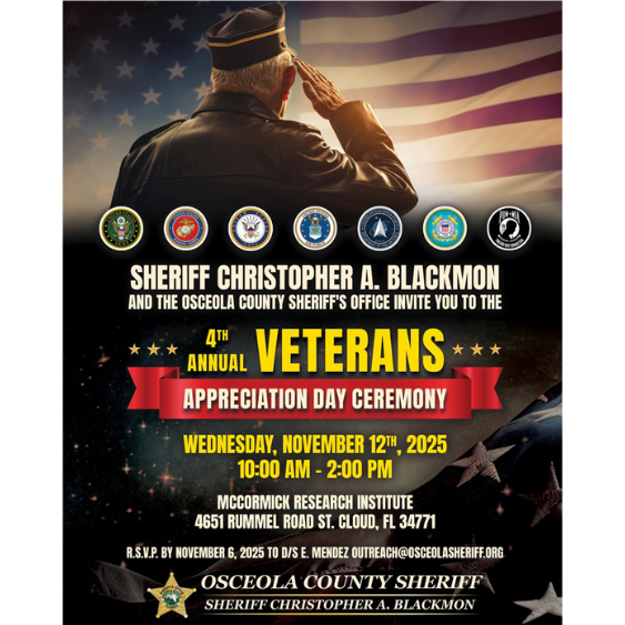 Sheriff Christopher A. Blackmon and the Osceola County Sheriff’s Office invite you to the 4th Annual Veterans Appreciation Day Ceremony: Wednesday, November 12, 2025, 10:00 a.m. – 2:00 p.m., McCormick Research Institute – 4651 Rummel Road, St. Cloud, FL 34771
