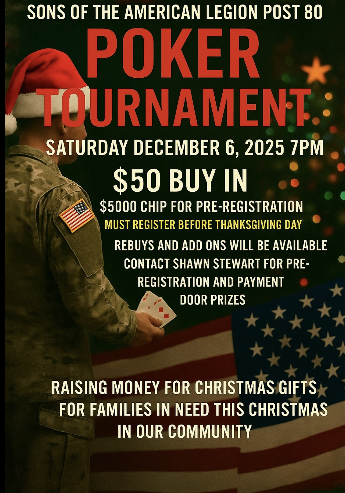 American Legion Post 80 1019 Pennsylvania Avenue, St. Cloud, FLPoker tournament to raise money for Christmas gifts for families in need this holiday season! Pre-register for an additional $5000 in chips! Pre-registration requires pre-payment!