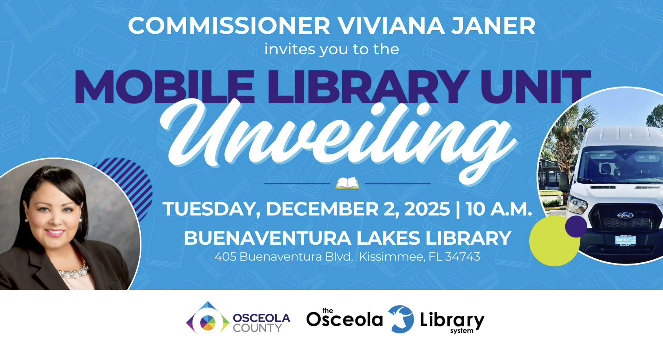 Buenaventura Lakes Library 405 Buenaventura Blvd, Kissimmee, FLOsceola County Commissioner Viviana Janer (District 2) invites you to the official unveiling of OLLie, the Osceola Library System’s newest Mobile Library Unit! Join us as we introduce a new way to bring library services directly to our community. OLLie will offer:• Library cards• Storytimes• Tech tutoring• Holds pickup• On-the-go library programming This mobile library […]