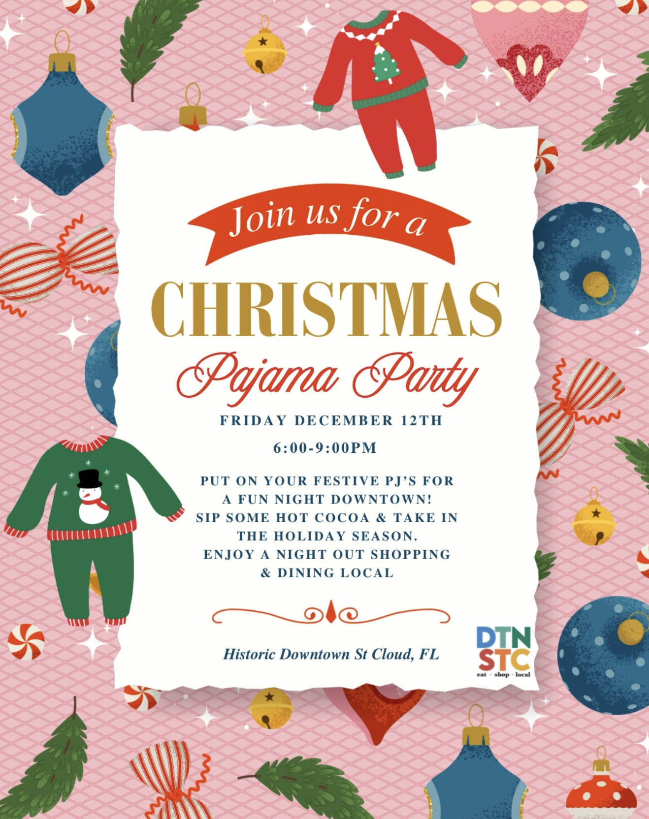Downtown St. Cloud New York Avenue, St. Cloud, FloridaBreak out your favorite festive pj’s and come for a fun shopping night in Downtown St Cloud! Enjoy a night of festive lights, hot cocoa and holiday shopping. Sip some evening cocktails, grab a bite to eat and don’t skip dessert!