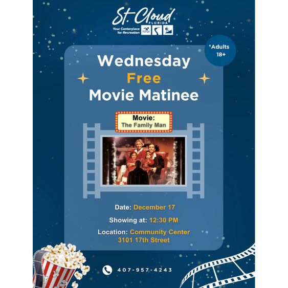 St Cloud Community Center 3101 17th St, St. Cloud, FLJoin us for a Free Movie Matinee at the Community Center on Wednesday, December 17th, at 12:30 p.m. This month's featured movie: The Family Man This 18+ event is perfect […]