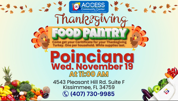 Access Community Center - Poinciana 4543 Pleasant Hill Road, Kissimmee, FLVisit us and get your Certificate to purchase your Thanksgiving Turkey! *While supplies last. One bag per household.*