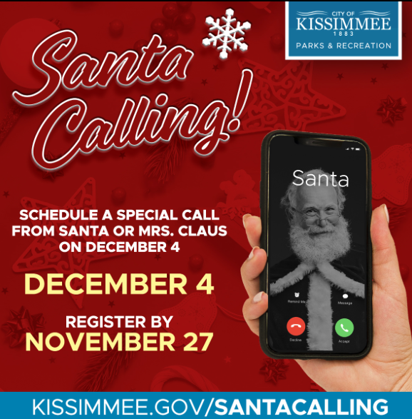 'Tis the season for Santa Calling! Schedule a special call from Santa or Mrs. Claus and create magical memories for your family this holiday season. The calls will take place on Thursday, December 4, and you must register by November 27 at kissimmee.gov/santacalling.