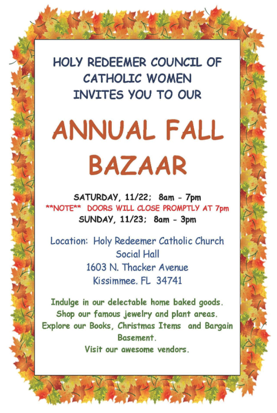 Holy Redeemer Catholic Church 1603 Thacker Ave., Kissimmee, FLIndulge in our delectable home baked goods.Shop our famous jewelry and plant areas.Explore our Books, Christmas Items and Bargain Basement.Visit our awesome vendors.