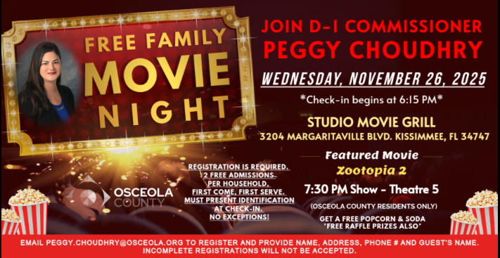 Studio Movie Grill - Margaritaville 3204 Margaritaville Blvd, Kissimmee, FLCommissioner Peggy Choudhry (D2) is hosting a FREE Family Movie Night for Osceola County residents! Come enjoy an evening of family fun with a showing of Zootopia 2 at Studio Movie Grill. Wednesday, November 26, 2025Check-in begins at 6:15 p.m.Movie starts at 7:30 p.m. (Theatre 5) Event Details:• Free for Osceola County residents• 2 free […]