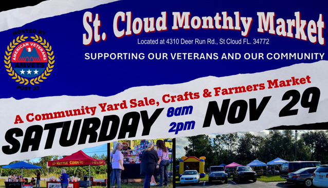 AMVETS Post 33 4310 Deer Run Drive, St. Cloud, FLBuy, Sell, Eat, Drink and have fun. Last Saturday of every month. There will crafts, art, yard sales, and farmers market. Food for the family. Bounce house for the kids and beer for the adults. Booths are FREE to AMVET Post 33 members, so sign up today. For booth rentals contact Jim @ 407-729-6787.