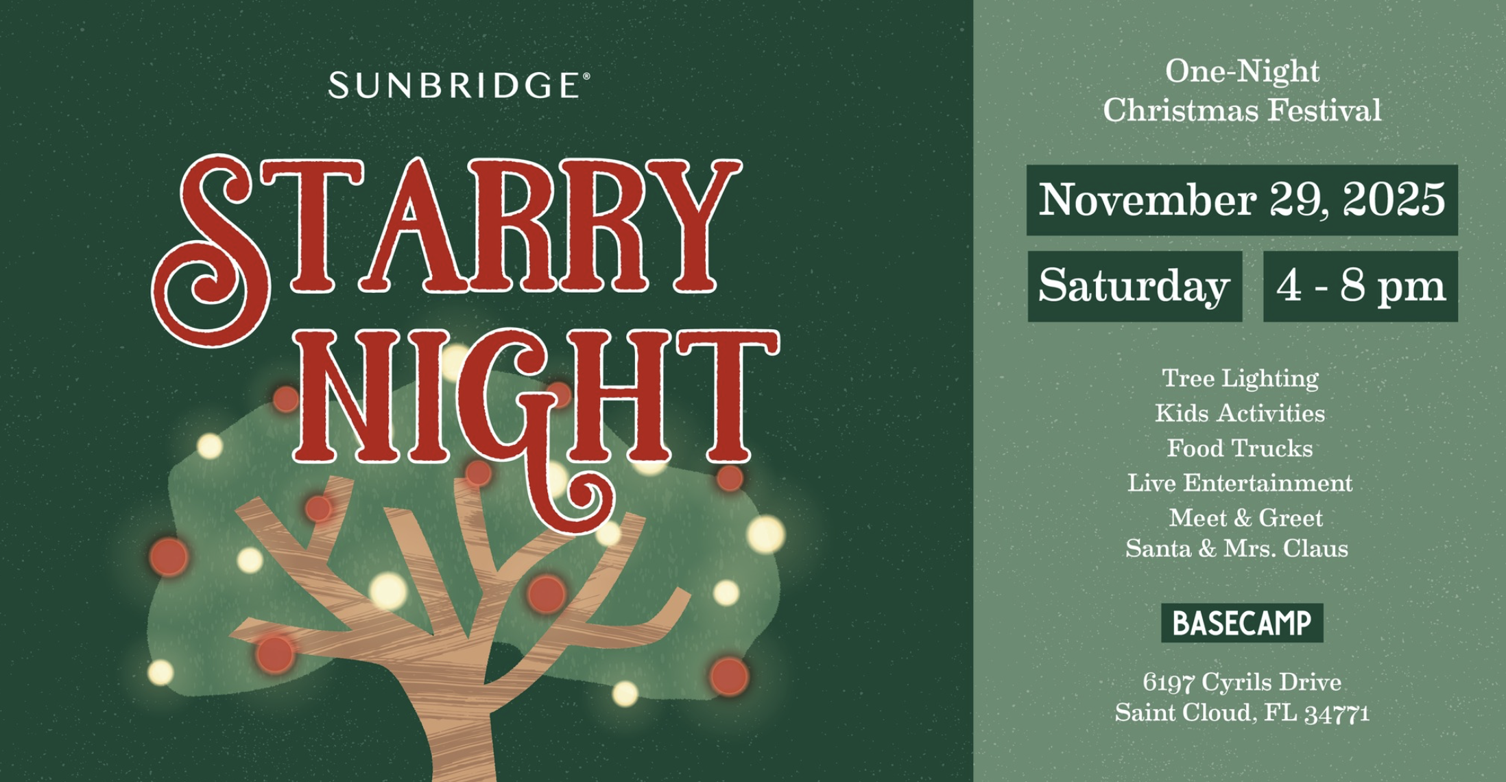 Sunbridge 6197 Cyrils Drive, St. Cloud, FLHoliday Tree Lighting Celebration at Sunbridge!Enjoy a night full of holiday fun: Visits with Mr. & Mrs. Claus: Snap a photo and share your wish listFestive Market: Shop for unique gifts and handcrafted treasures from local artisansMagical Snowfall: Experience a flurry of “snow” right here in Sunbridge Food Trucks: Savor seasonal bites and sweet treats […]