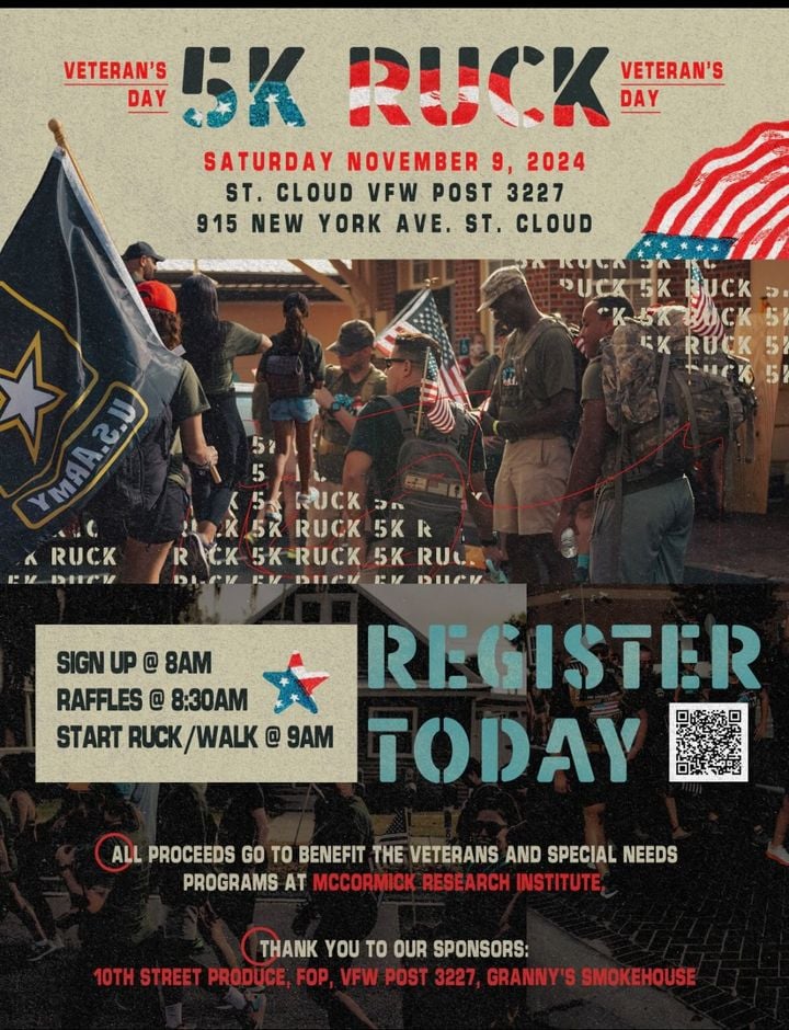 VFW Post 3227 Auxiliary 915 New York Ave, St. Cloud, FLJoin the Veteran's Day 5K Ruck on Saturday, November 9, 2024, at St. Cloud VFW Post 3227. Sign-up begins at 8 AM, with raffles at 8:30 AM, and the ruck/walk starts at 9 AM. Proceeds benefit veterans and special needs programs at the McCormick Research Institute. Sponsors include 10th Street Produce, FOP, VFW Post 3227, […]