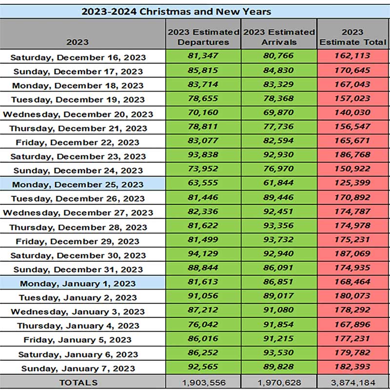 Nearly 3.9 million passengers are expected during the 23-day Christmas/New Year’s travel period nationally, a 13.5 % increase over last year.